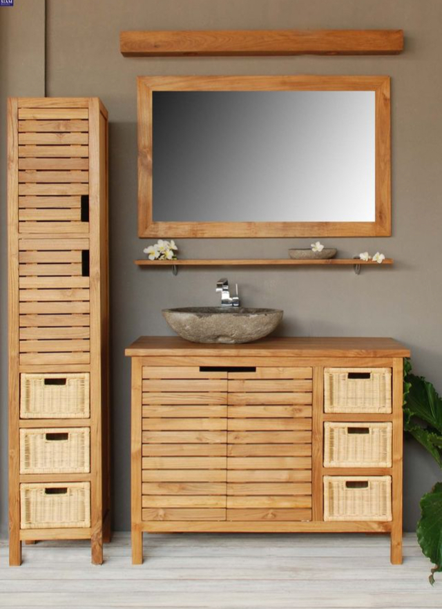 Tamamı ahşaptan tasarlanıp ahşap koruyucu ile parlaklık ve şıklık katarak her evin banyosunu zarif bir güzellik katan banyo dolabı